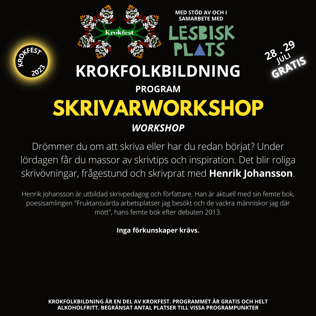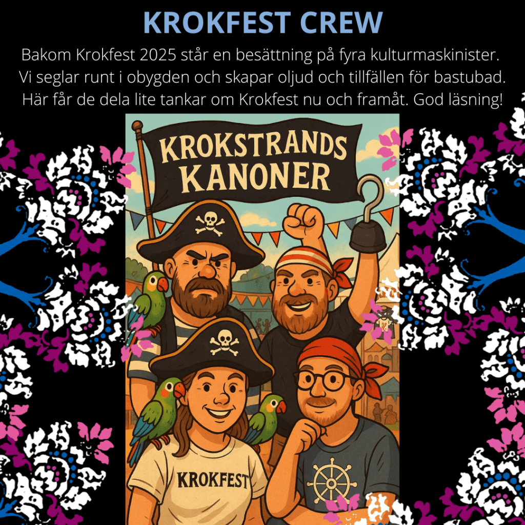 – Tjohej! Ja, mig blir de inte av med i första taget! Krokfest innebär ju en massa jobb, vilket han vara slitigt – men att vara med i arrangörsgruppen det är också som att mikrodosera den där goa sensommarkänslan året runt. I år tycker jag det är extra fint att vi skaffat oss en ny gängmedlem – Johannes! Varmt välkommen!